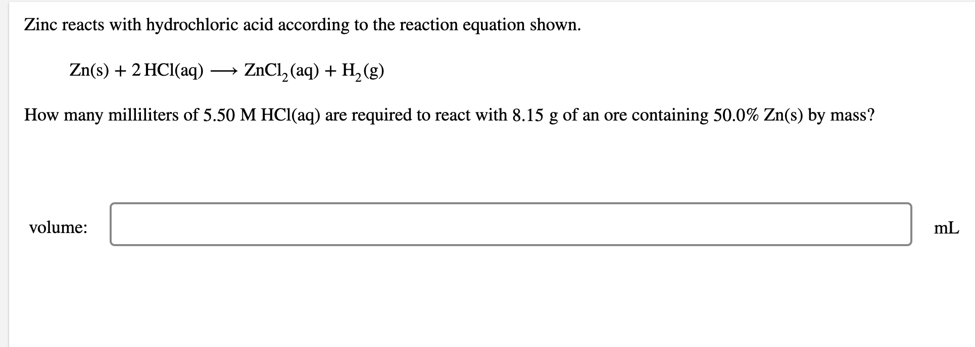 Solved Zinc reacts with hydrochloric acid according to the Zinc Reacts With Hydrochloric Acid Formula zinc metal reacts with hydrochloric acid according to the balanced equation: this chemistry video tutorial explains how to predict the products of the single replacement reaction between zinc. Let’s examine the example of the interaction between zinc and hydrochloric acid. zn + hcl = zncl2 + h2 is a single displacement (substitution) reaction where one mole of. Zinc Reacts With Hydrochloric Acid Formula.